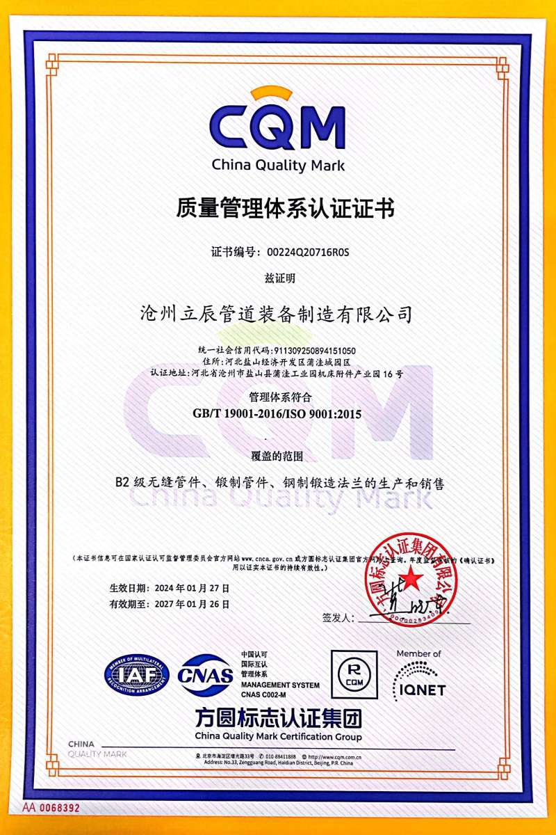2024年,滄州立辰管道裝備制造有限公司(以下簡(jiǎn)稱“滄州立辰管道”)憑借過硬的技術(shù)實(shí)力和嚴(yán)謹(jǐn)?shù)馁|(zhì)量管理體系,成功通過國(guó)家壓力管道元件制造許可證認(rèn)證,并同步獲得ISO9001:2015質(zhì)量管理體系國(guó)際認(rèn)證。這一雙重認(rèn)證的取得,標(biāo)志著企業(yè)在產(chǎn)品合規(guī)性、生產(chǎn)標(biāo)準(zhǔn)化及質(zhì)量管理水平上邁入新高度,進(jìn)一步鞏固了其在管道制造領(lǐng)域的核心競(jìng)爭(zhēng)力。